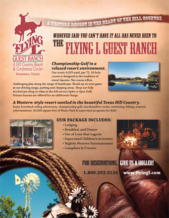 For more information on the the Flying L Guest Ranch, visit their webiste at www.flyingl.com or call them toll free at (800) 292-5134.