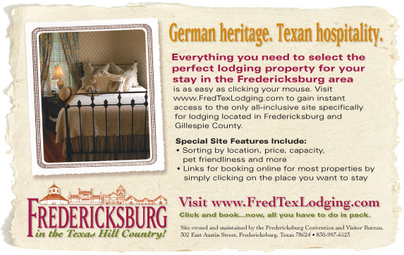 To plan a trip to Fredericksburg, located in the heart of the Texas Hill Country, call (830) 997-6523 or 1-888-997-3600 (toll-free in the U.S.) to request a free visitor kit or visit www.fredericksburg-texas.com.